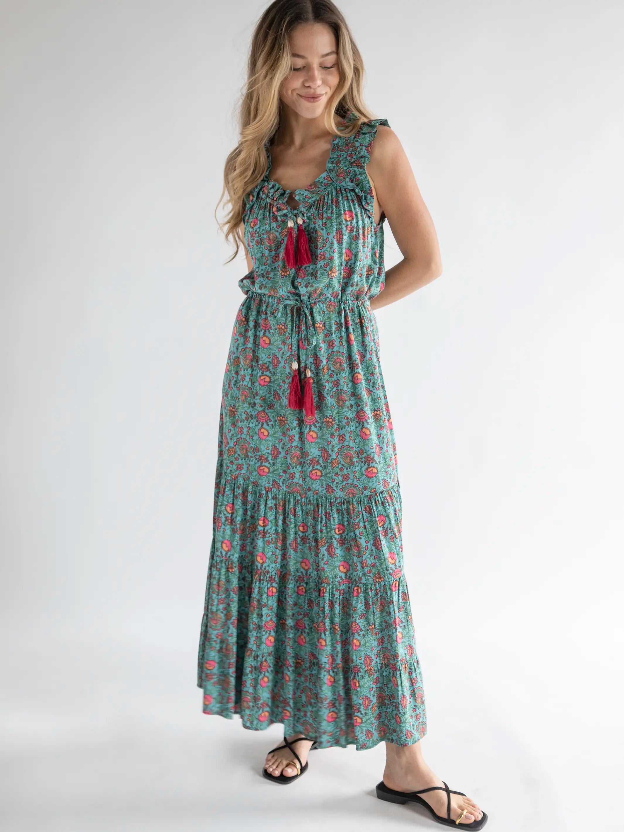 Patti Tie-Front Maxi Dress - Turquoise Yellow Fan Medallion