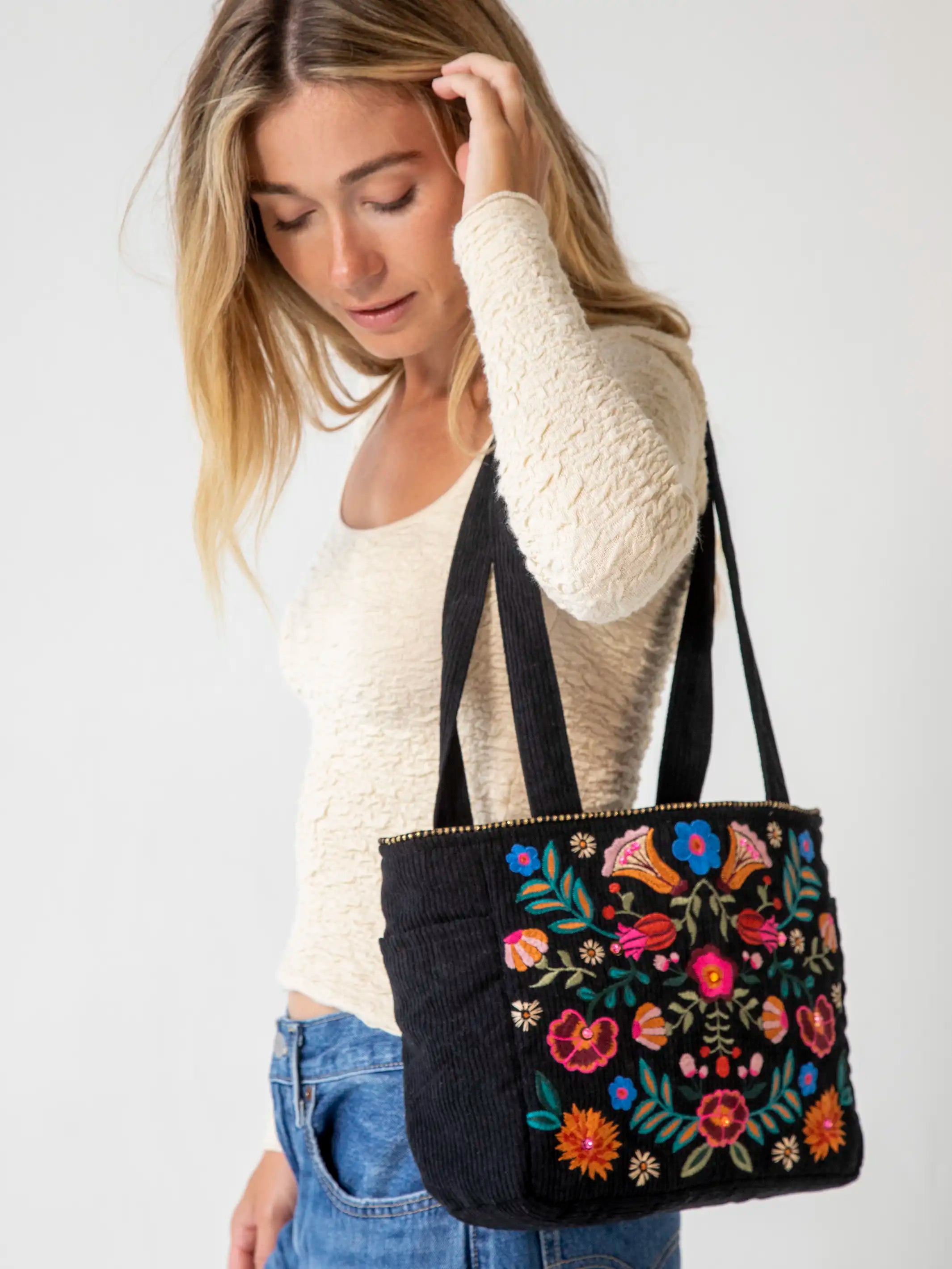 Embroidered Corduroy Tote - Black Folk Flower