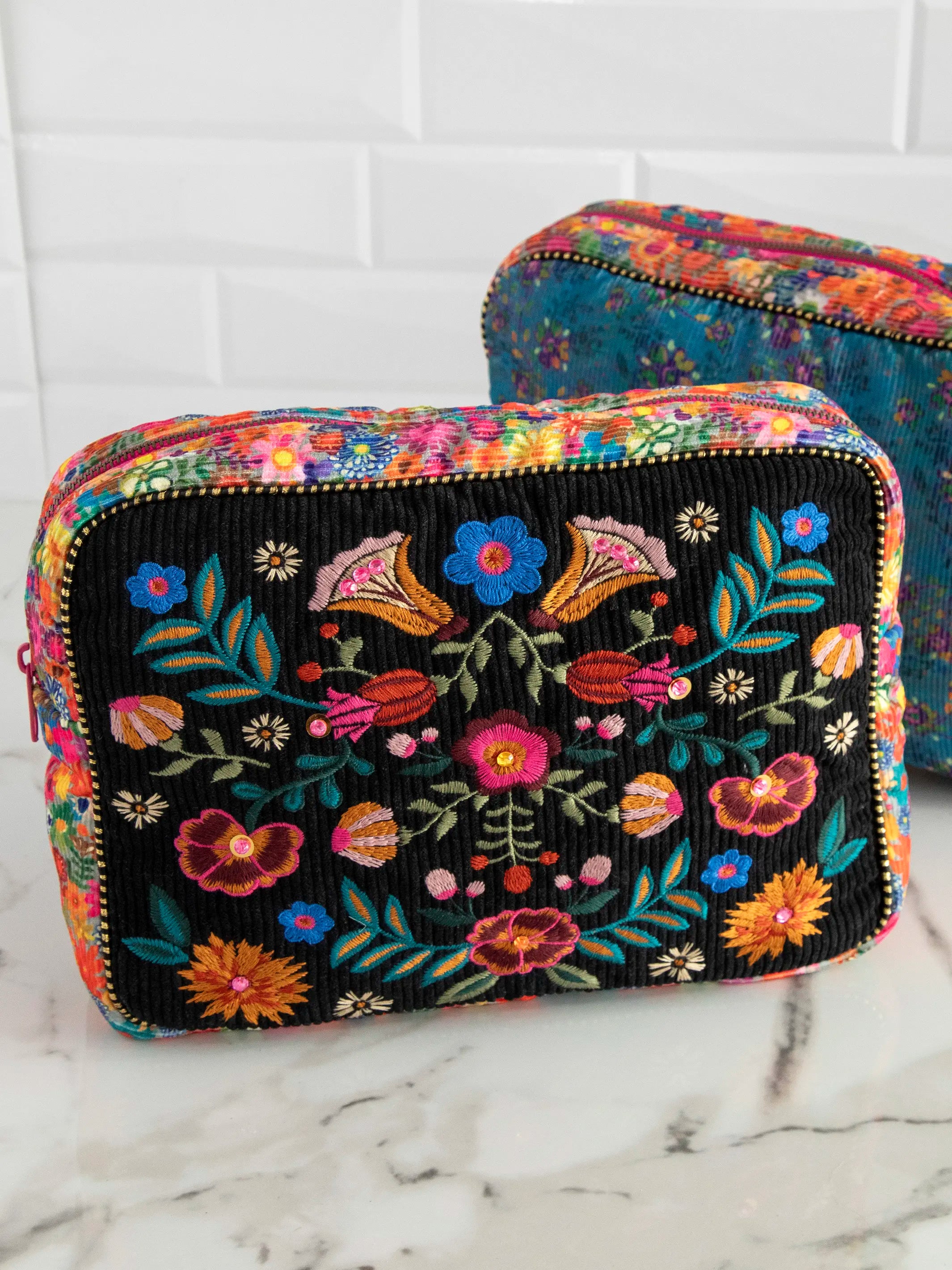 Embroidered Corduroy Cosmetic Pouch - Black Folk Flower