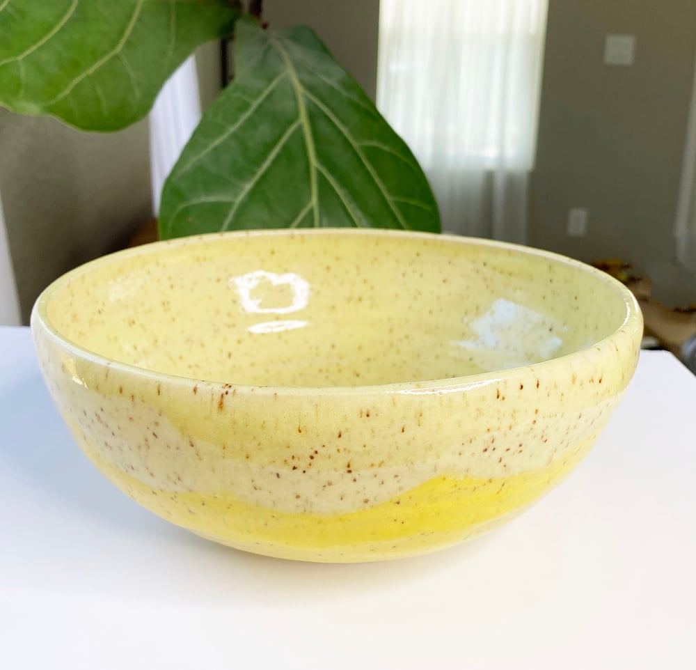 This is a handmade Bowl! 2 Shades of yellow glazes on top of speckled buff clay. Food safe. Ok to use on the top shelf of dishwasher, but hand wash is recommended. Each piece is one of a kind. There may be some natural imperfections and we embrace that! 7 3/4" Width x 3" Height