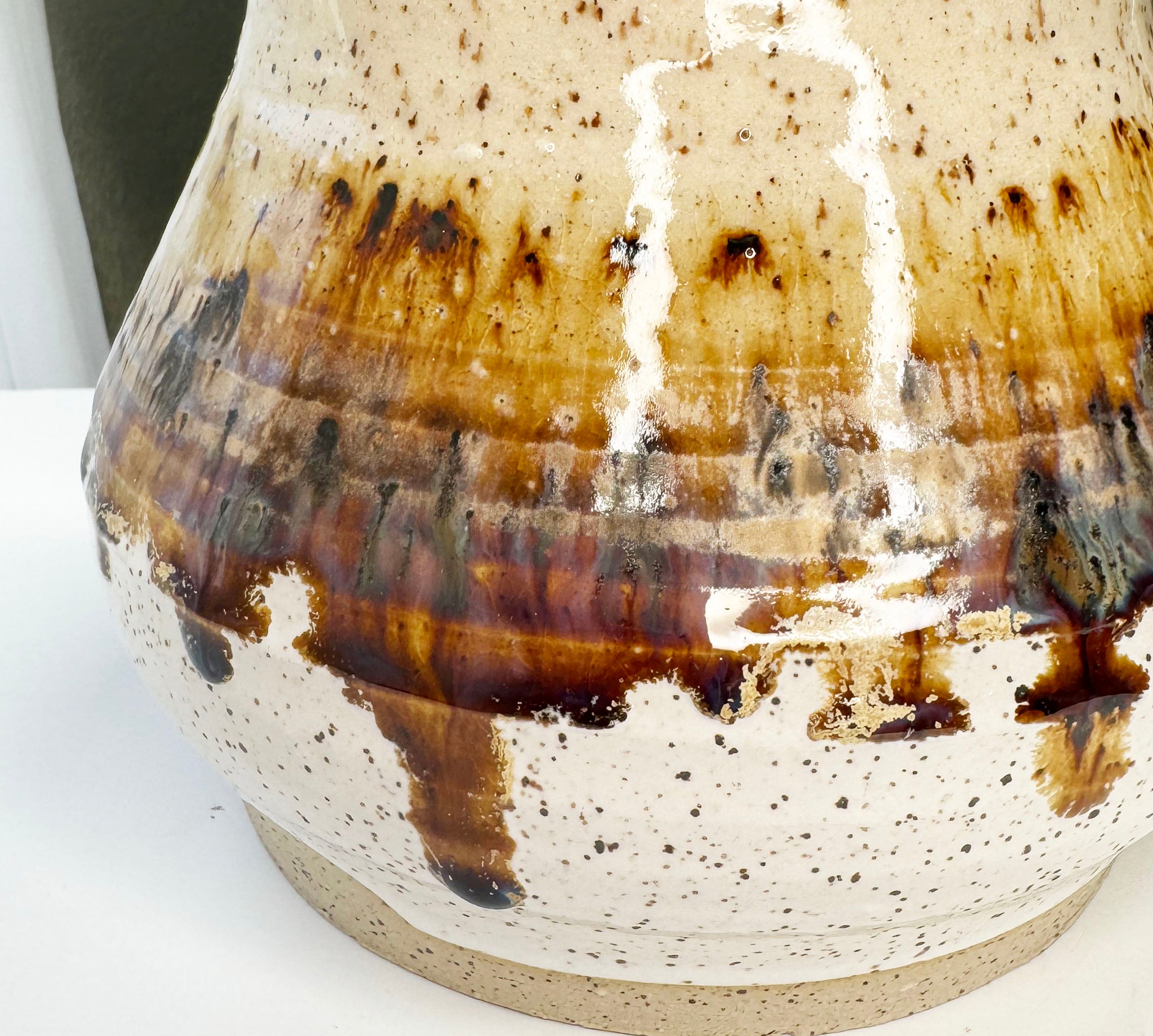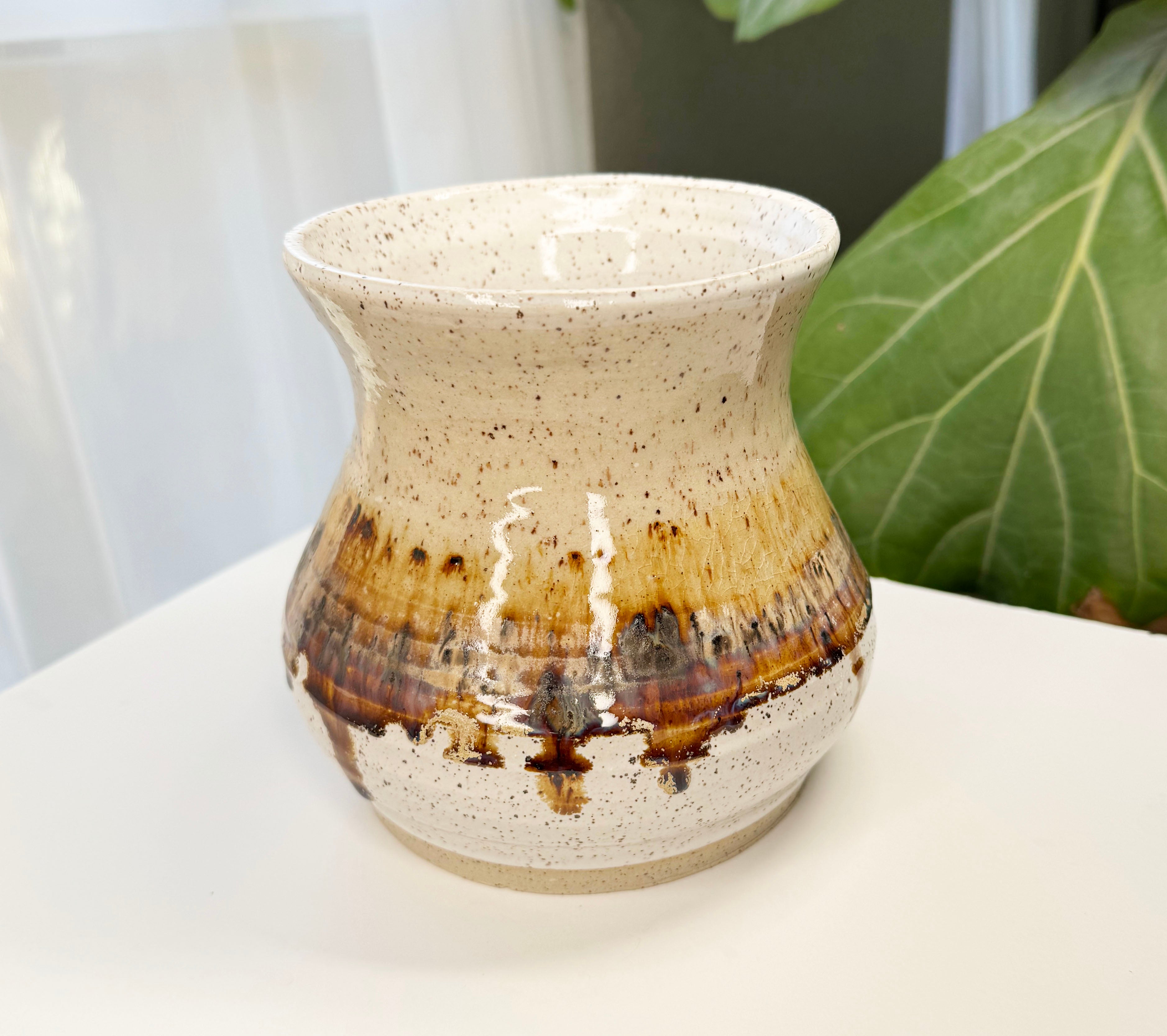 This is a handmade Vase! 3 different glazes on top of speckled buff clay. Ok to use on the top shelf of dishwasher, but hand wash is recommended. Each piece is one of a kind. There may be some natural imperfections and we embrace that!