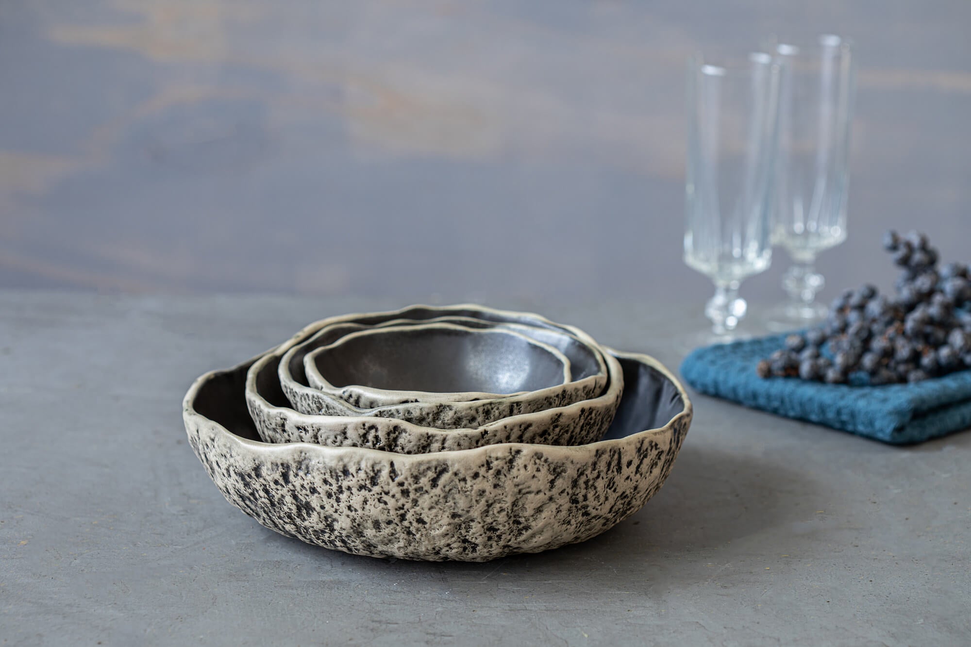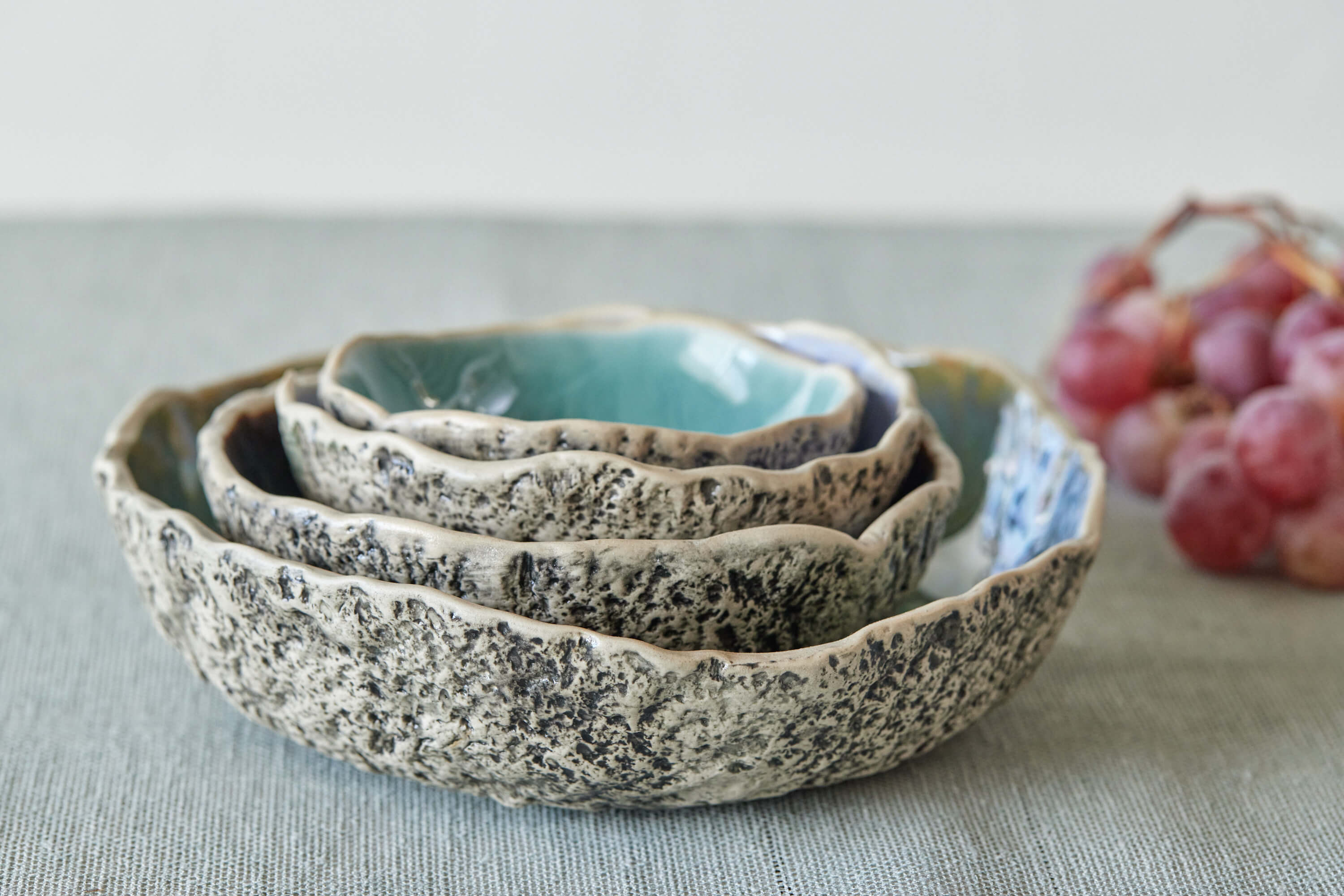 Discover this beautiful set of four nesting bowls. These stacking bowls offer a sophisticated way to serve all sorts of dishes, from crisps to hummus, salads and pasta, and can be neatly stored away to save on space. There are seven unique effect glazes available. Mix, match and play with the glaze colours to your likings.